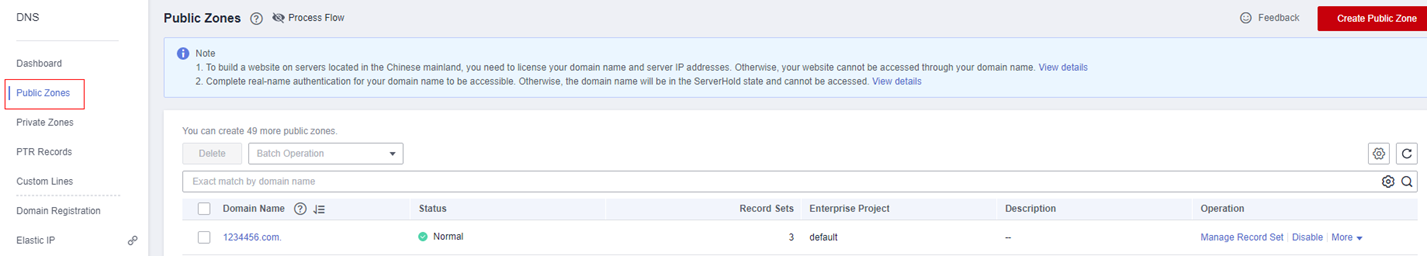 After the domain name is created, you can view it in the domain name list on the Public Zones page.