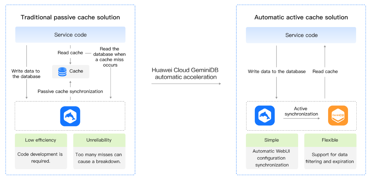 The conventional caching solution is inefficient and unreliable because users have to develop code for caching TaurusDB instance data. GeminiDB provides an automated proactive caching solution to prevent transaction failures caused by cache breakdown. After parameters are configured on the GUI, data can be automatically synchronized. You can also filter data and set a validity period to enhance development efficiency and data reliability.