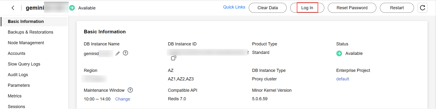 Alternatively, click the instance name to go to the Basic Information page. Click Log In in the upper right corner of the page.