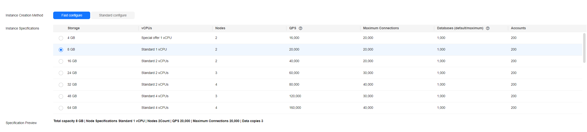 - On the displayed page, select a billing mode, configure instance specifications, and click Next.