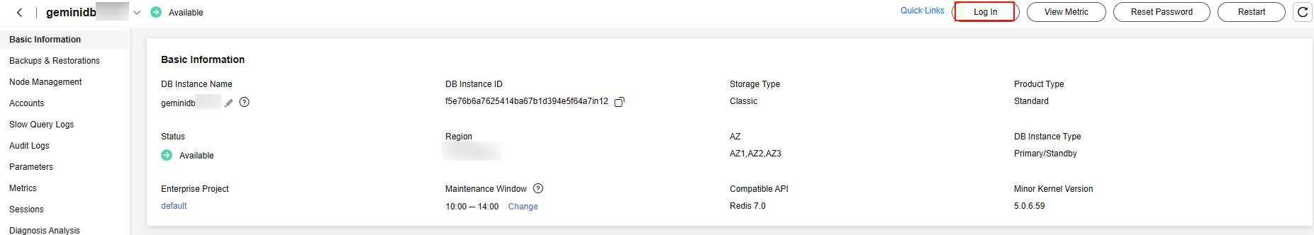 Alternatively, click the instance name to go to the Basic Information page. Click Log In in the upper right corner of the page.
