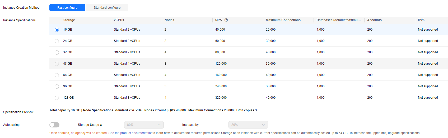 - On the displayed page, select a billing mode, configure instance specifications, and click Next.