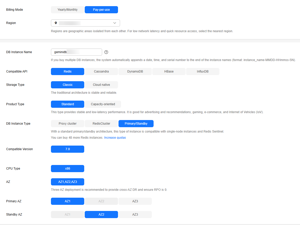 Availability zone where the instance is created. An AZ is a part of a region with its own independent power supplies and networks. AZs are physically isolated but can communicate with each other over a private network. If there are multiple AZs, you need to select primary and standby AZs. Instances can be deployed in a single AZ or three AZs.