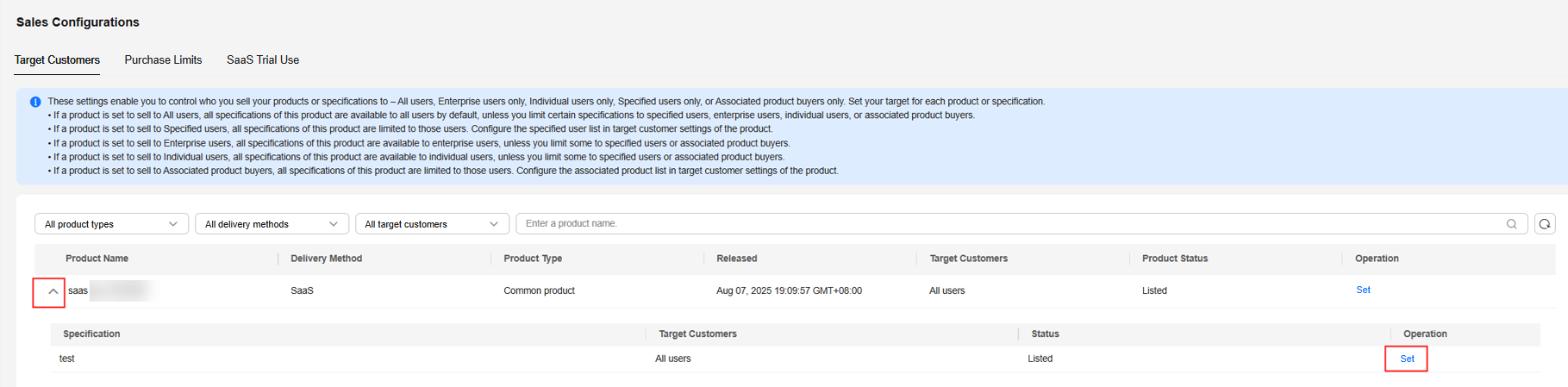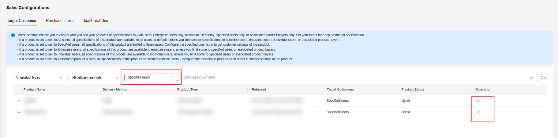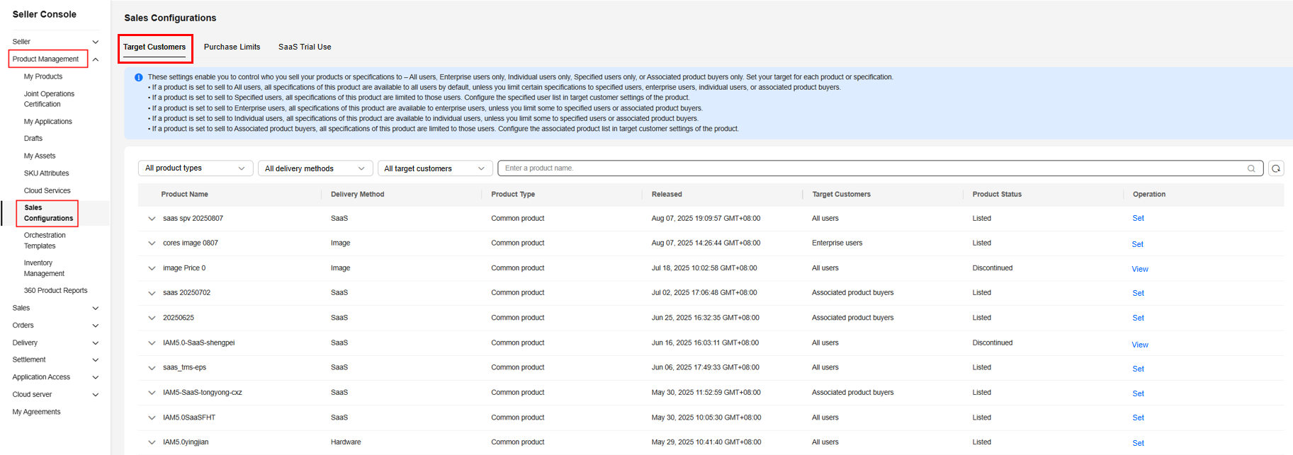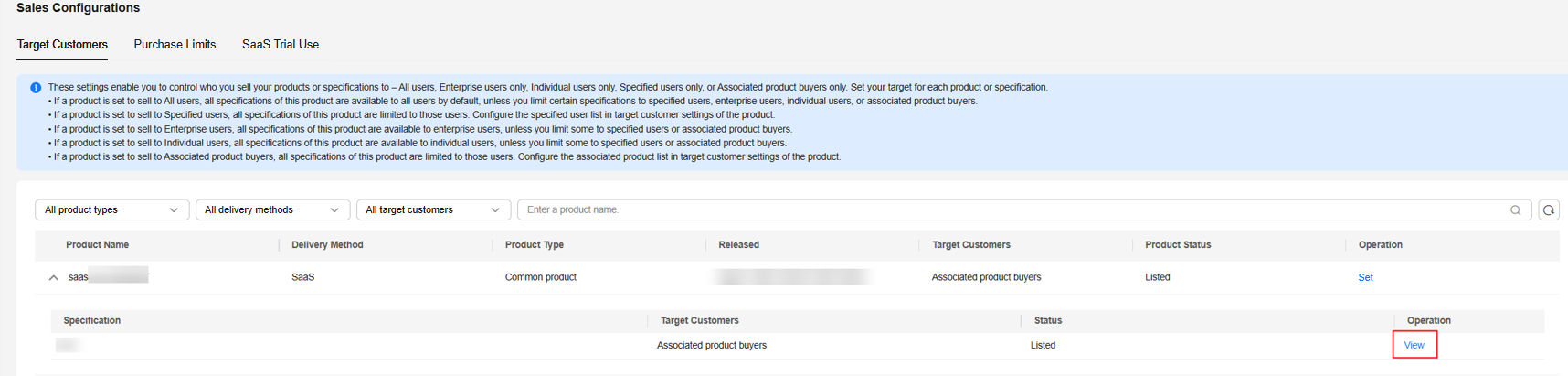 - In the navigation pane, choose Product Management > Sales Configurations. On the displayed page, click the Target Customers tab.