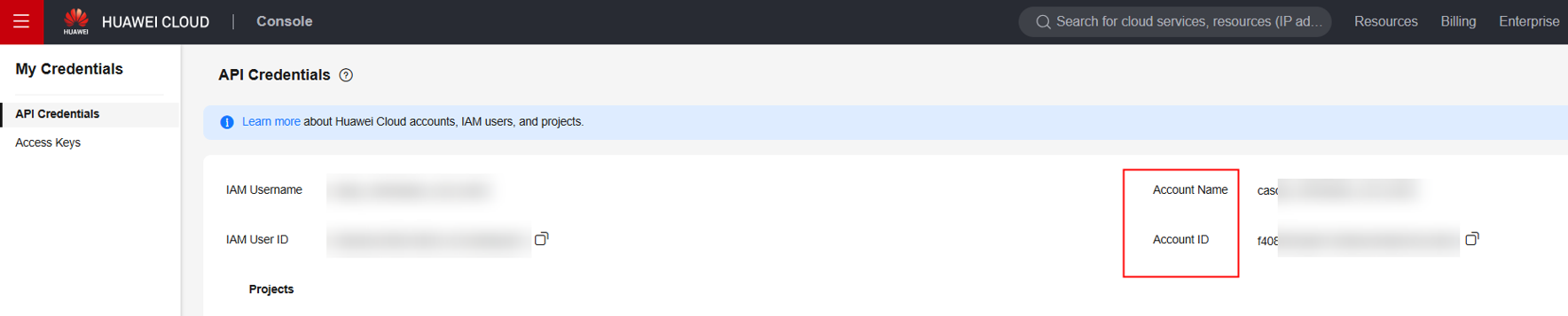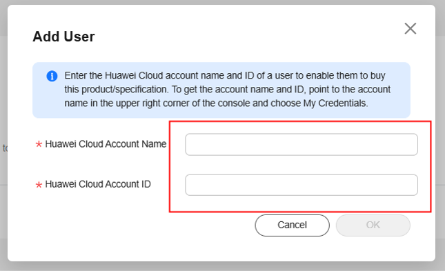 - Enter a Huawei Cloud account name and ID of a user and click OK.