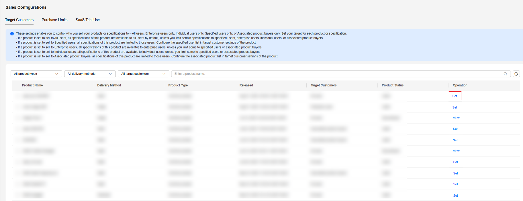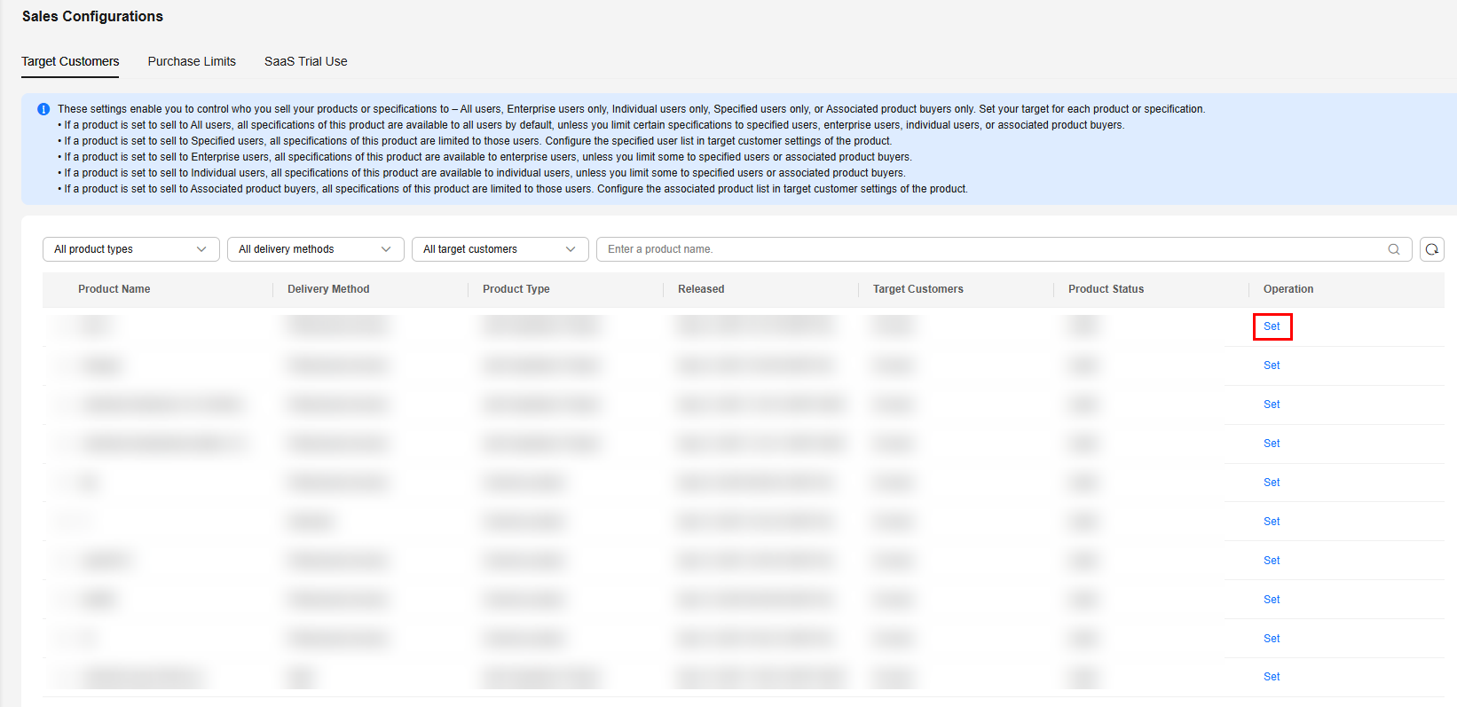 - On the Sales Configurations page, click Set in the Operation column of the target product.