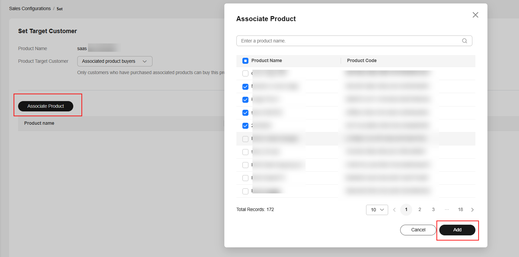 - Click Associate Product. In the displayed dialog box, select the associated products and click Add.