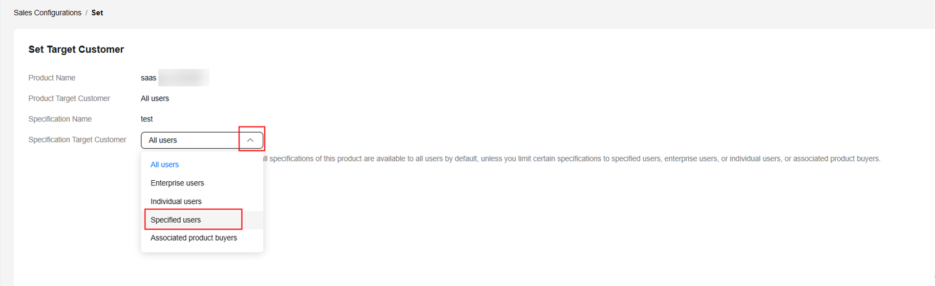 - If a product is set to sell to Specified users or Associated product buyers, all its specifications are limited to only those users. You cannot change the target customers of the specifications.
