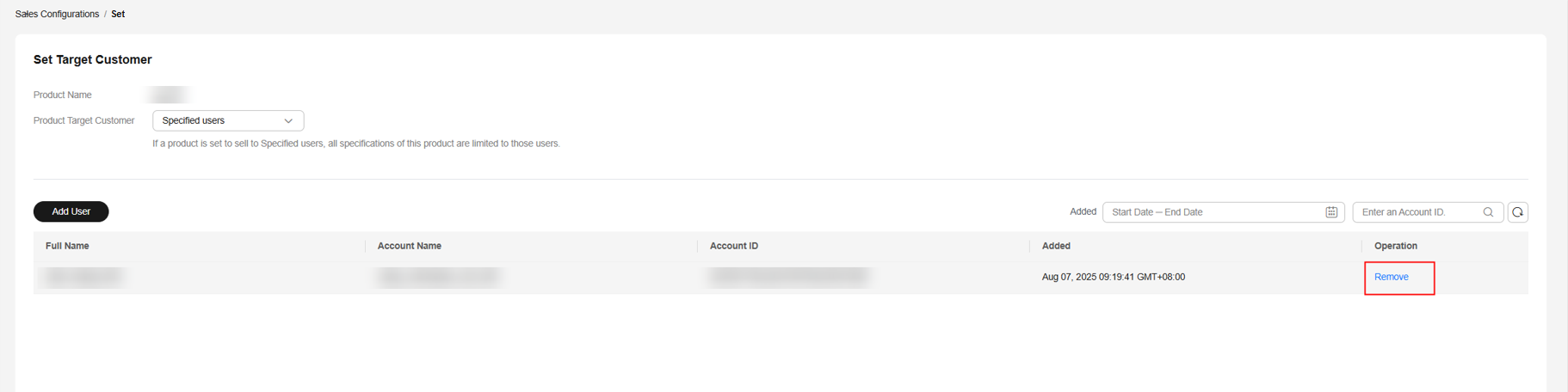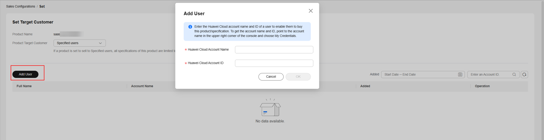 If Specification Target Customer is set to Specified users, add Huawei Cloud accounts of the specified users so that they can purchase the product. For details about how to add users, see Adding a User.