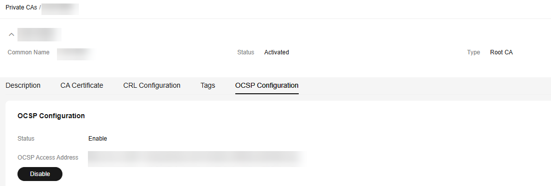 - Disable OCSP: If OCSP is disabled for a private CA, the private certificate extension issued by the private CA does not contain the OCSP access address.