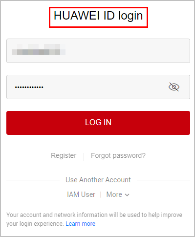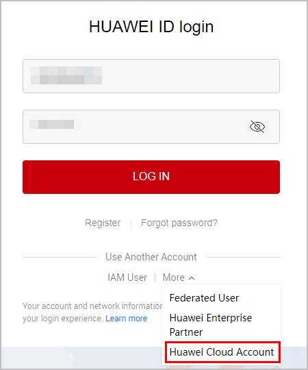 If your Huawei Cloud account has been upgraded to a HUAWEI ID, use the HUAWEI ID to log in. For details, see Logging In with a HUAWEI ID.