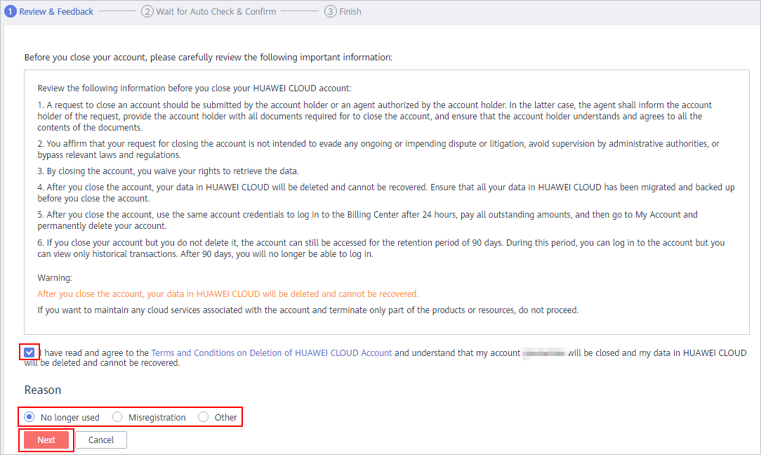 - Read the Terms and Conditions on Deletion of Huawei Cloud Account and select I have read and agree to the Terms and Conditions on Deletion of Huawei Cloud Account and understand that my account XXX will be closed and my data in Huawei Cloud will be deleted and cannot be recovered. Then select a reason for closing the account.