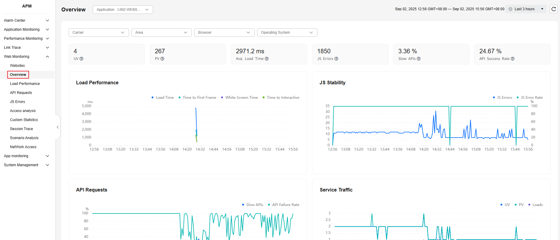 on the left and choose Management & Governance > Application Performance Management. - In the navigation pane on the left, choose Web Monitoring > Overview.