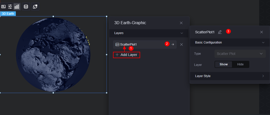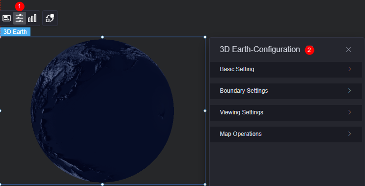 In the data settings, you can set the data source of the 3D Earth widget. For more information, see Data Access.
