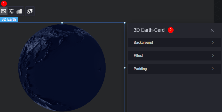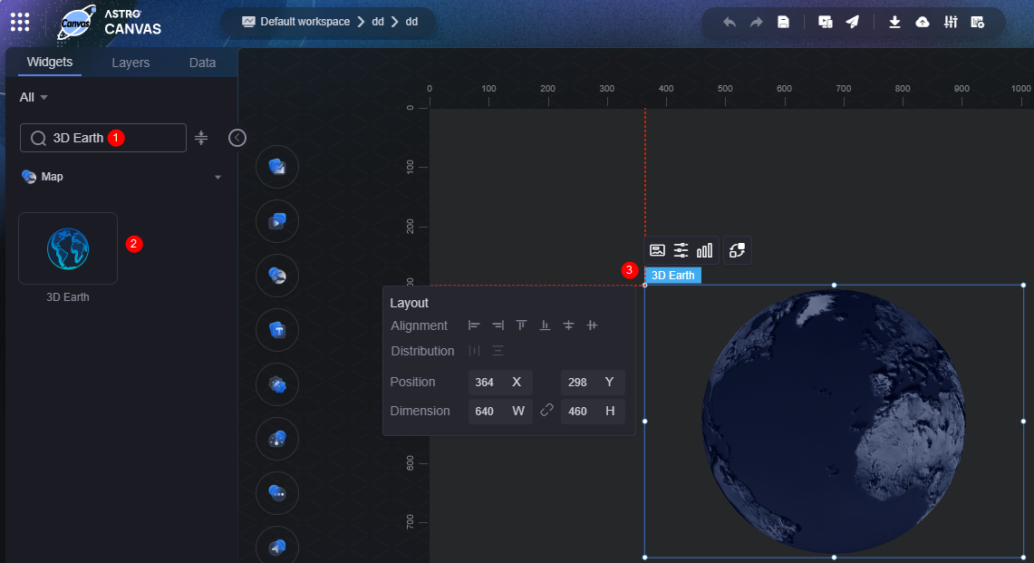 On the large screen design page, drag the 3D Earth widget from Map to the blank area of the canvas, as shown in Figure 1.