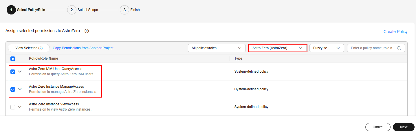 - Select the Astro Zero Instance ManageAccess and Astro Zero IAM User QueryAccess system policies and click Next.