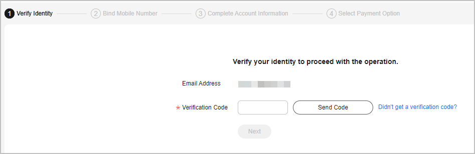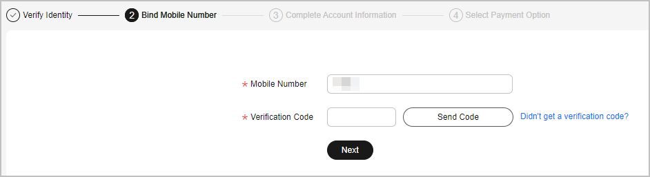 - Enter a mobile number allocated in the region where your account is registered, click Send Code, and enter the SMS verification code in the text box.