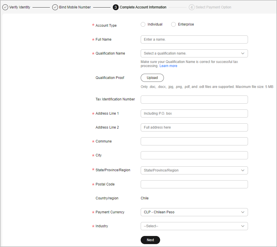 - Select an account type (Individual or Enterprise), and enter the required information.