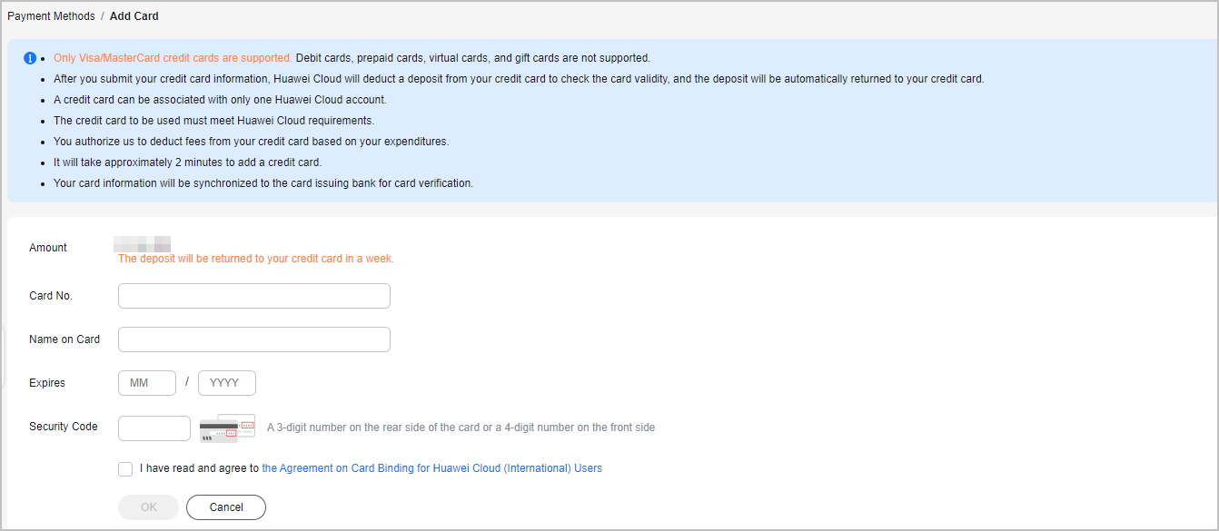 When you add a card, Huawei Cloud makes a $1 USD (or an equivalent amount in other currencies) charge to verify the card is valid. This charge will be refunded to your credit card later. The time it takes to refund the charge depends on your card issuing bank.