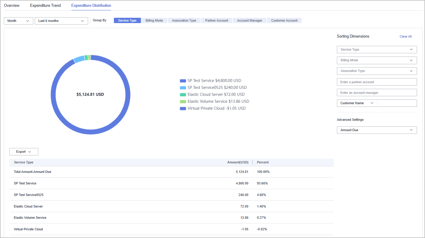 • Select the Expenditure Distribution tab, select a time range, and set the grouping basis (service type, billing mode, association type, account manager, and customer account) to view the expenditure distribution of customer expenditures and detailed fees. You can also set criteria in Sorting Dimensions and Advanced Settings on the right.