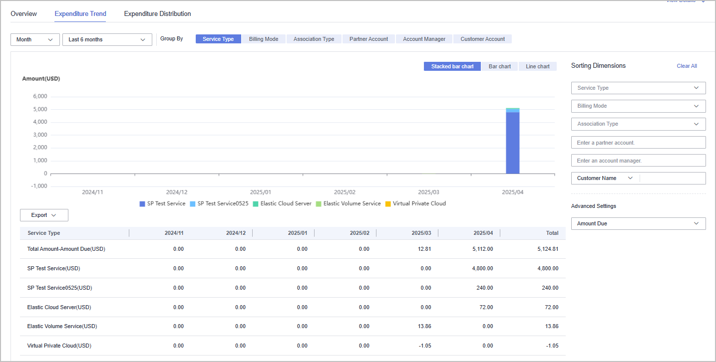 • Select the Expenditure Trend tab, select a time range, and set the grouping basis (service type, billing mode, association type, partner account, account manager, and customer account) to view the expenditure trend of customers and detailed fees. You can also set criteria in Sorting Dimensions and Advanced Settings on the right.