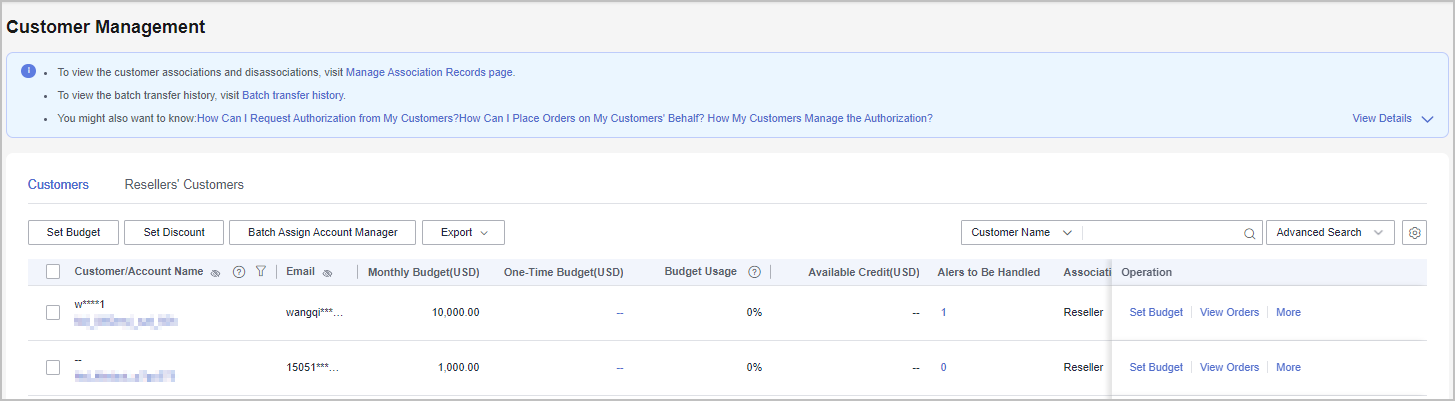 You can check the used budget and the basic information of your customers and all customers associated with your managed resellers.
