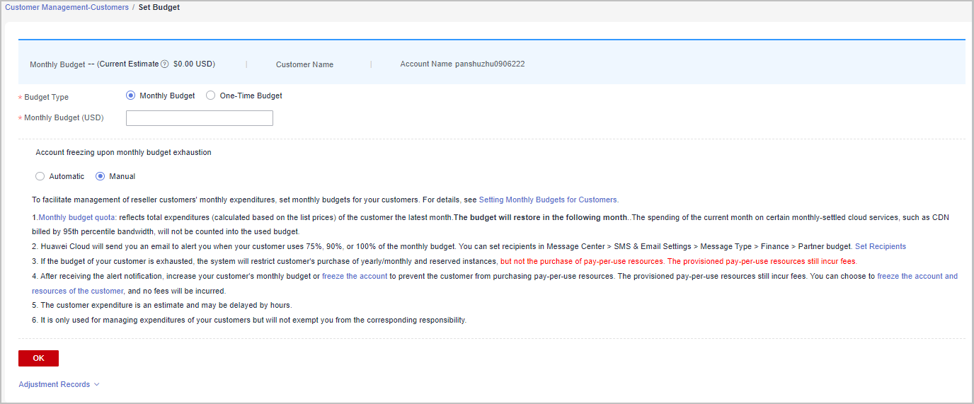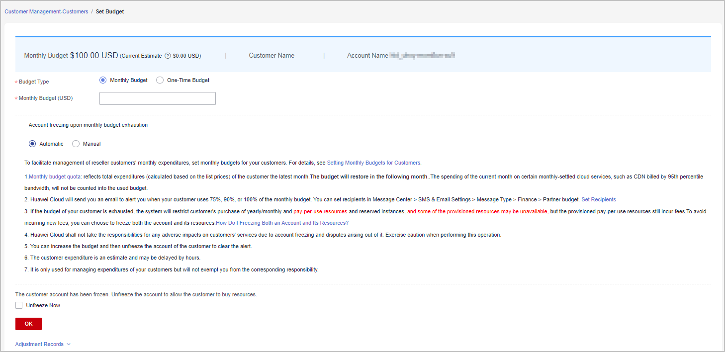 - When you set a monthly budget for a customer, set Account freezing upon monthly budget exhaustion to Automatic or Manual. Automatic indicates that the system automatically freezes an account upon budget exhaustion. For details about how to manually freeze an account, see Freezing an Account.