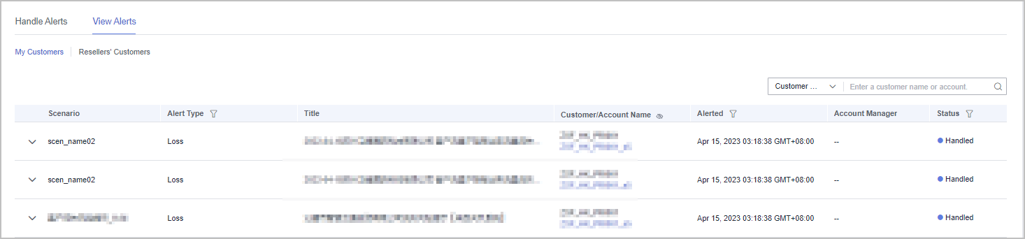 to view alert details and alert handling information. - On the right corner above the list, enter a customer name or an account manager name to filter alerts.