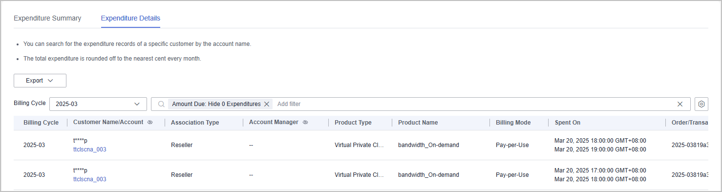 You can check expenditure details of a customer in a billing cycle, including the customer name, customer account name, association type, account manager name, product type, product name, order number, expenditure amount, and payment status.