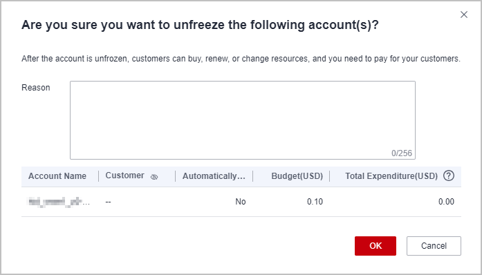 5. Enter the reason and click OK. A message is displayed, indicating that the account is unfrozen.