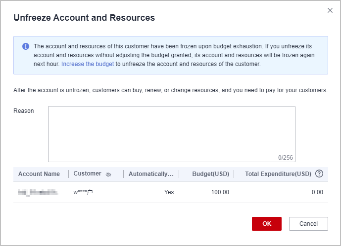 - Enter the reason and click OK. A message is displayed, indicating that the account and resources are unfrozen.