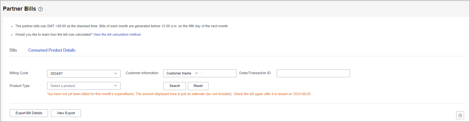 In Partner Center, you can export bill details on the Consumed Product Details tab of the Sales > Financial Information > Partner Bills page.