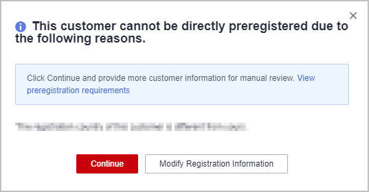 - (Optional) If you still want to preregister a customer who does not meet the preregistration conditions, submit a manual review request.