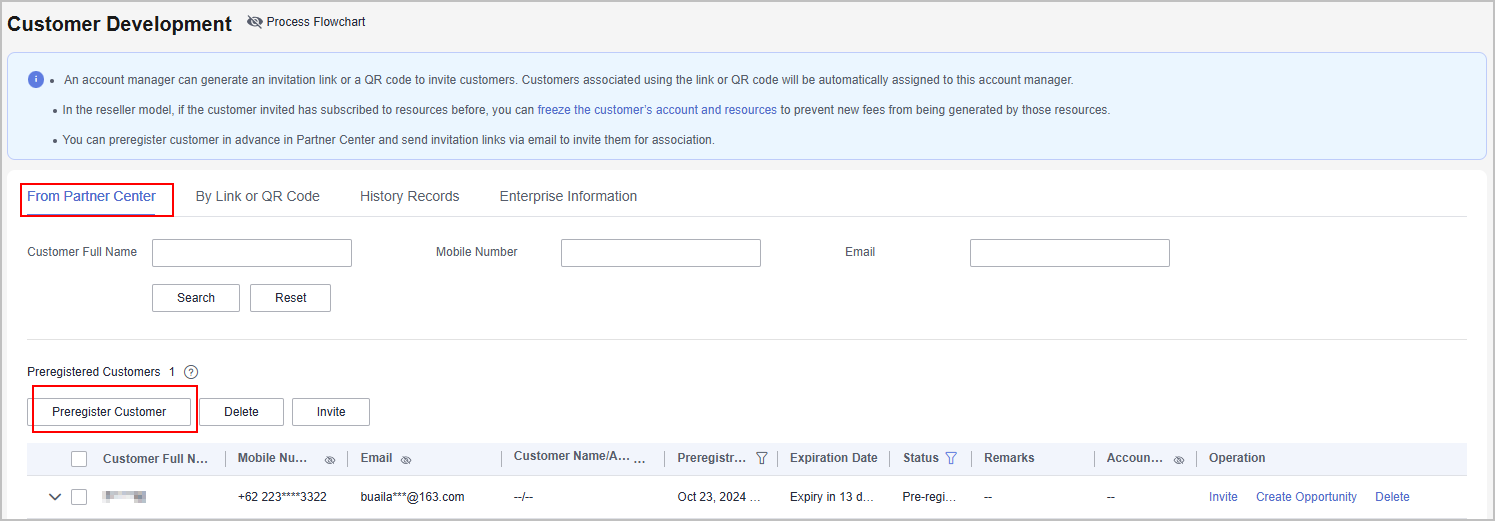 - You can query the preregistered customer by full name, mobile number, or email on the From Partner Center tab page. If the status of the customer changes to Pre-registered, the preregistration is successful. Then, you can invite the customer for association.