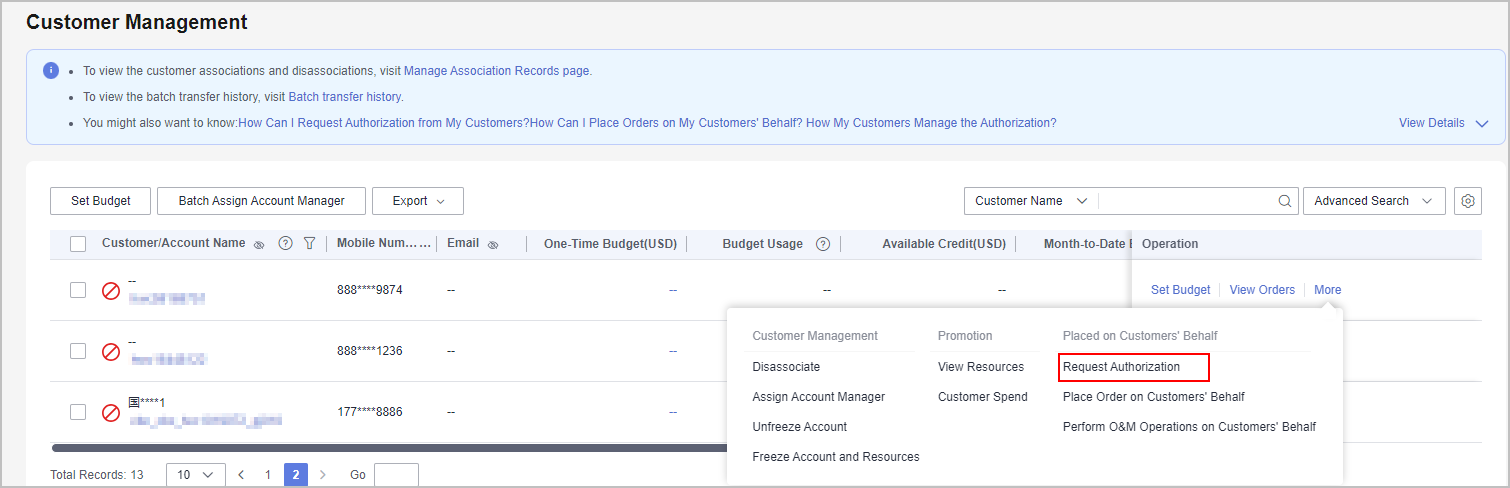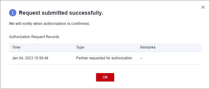 A message is displayed, indicating that the authorization request has been sent to the customer. The customer can manage the authorization requests on the My Account > My Partner page.