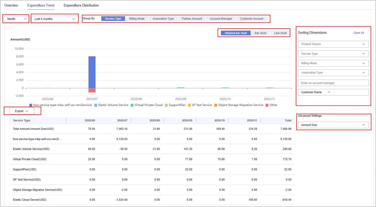 • If you filter the expenditure trend data by product source (including KooGallery and Huawei Cloud), service type, billing mode, association type, account manager, customer name, and customer account, the filtered data is displayed in the trend chart and list.