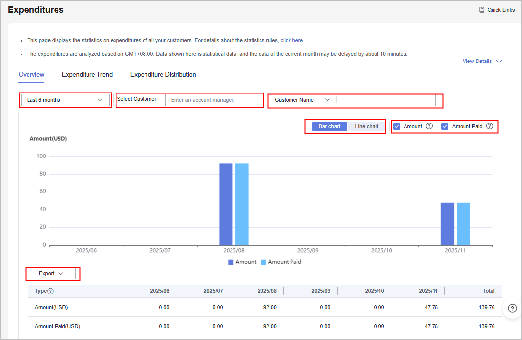 • You can filter the expenditure data as required. After confirming the filter criteria, click Export > Export Selected to export the filtered customer expenditure data. Click Export > View Export, and click Download in the Operation column to download the exported expenditure data that is in the Completed state.
