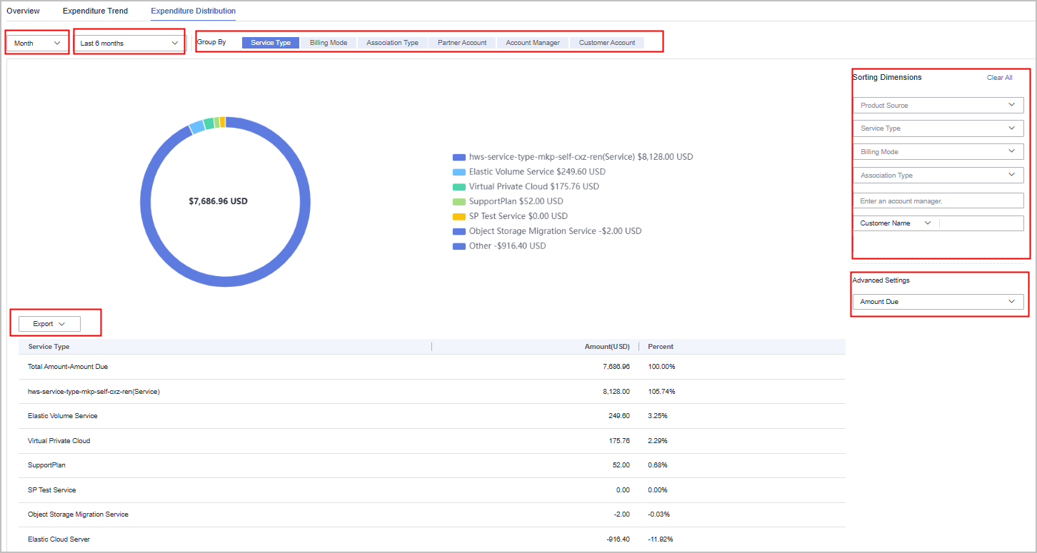 • If you filter the expenditure trend data by product source (including KooGallery and Huawei Cloud), service type, billing mode, association type, account manager, customer name, and customer account, the filtered data is displayed in the distribution chart and list.