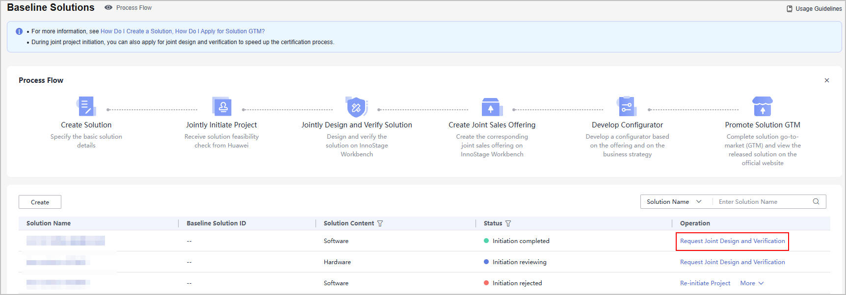 1. On the Baseline Solutions page, find the solution which a project initiation application has already been submitted for and click Request Joint Design and Verification in the Operation column.