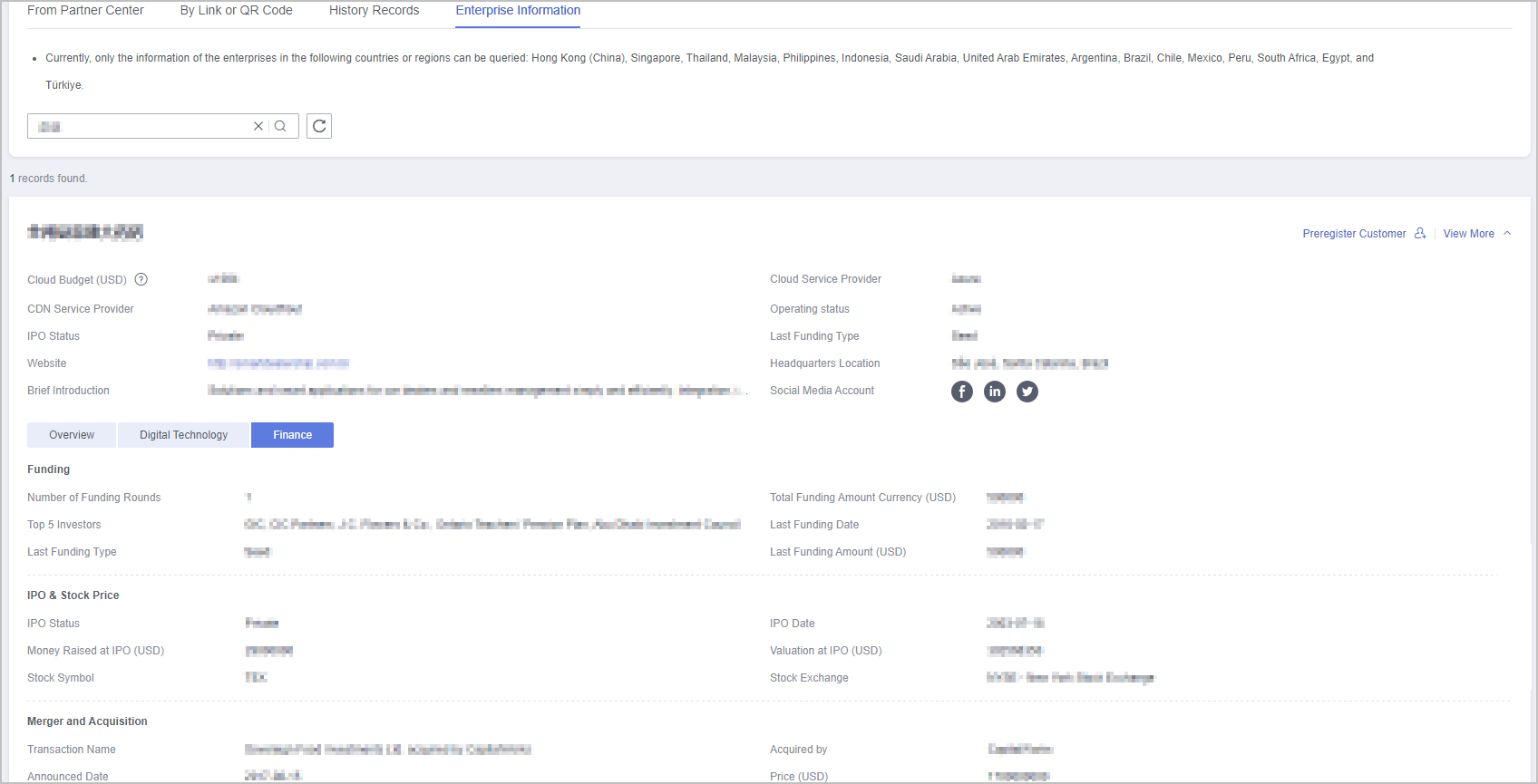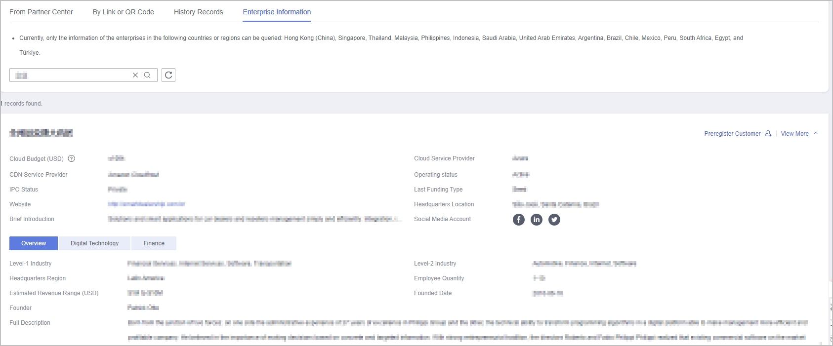 - Click View More to view enterprise details (Overview, Digital Technology, and Finance).