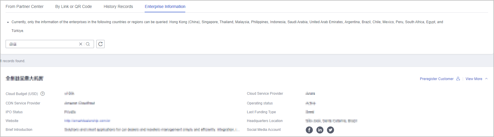 Currently, only the information of the enterprises in the following countries or regions can be queried: Hong Kong (China), Singapore, Thailand, Malaysia, Philippines, Indonesia, Saudi Arabia, United Arab Emirates, Argentina, Brazil, Chile, Mexico, Peru, South Africa, Egypt, and Türkiye.