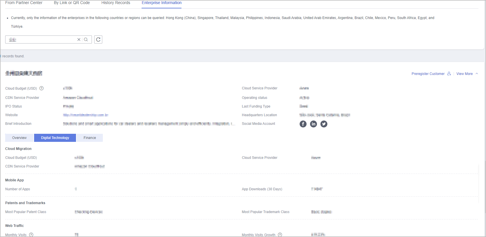 - Click the Digital Technology tab to view the cloud migration information, app information, patent and trademark information, and website traffic.