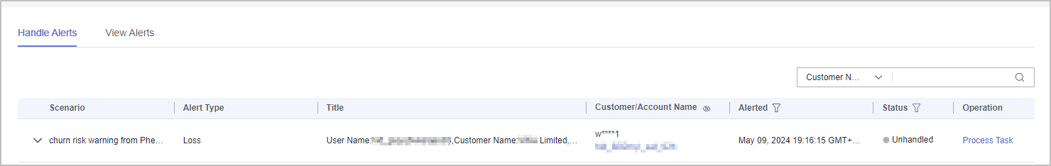 4. On the Handle Alerts tab, view information about the scenario, alert type, title, customer account or account name, alert generation time, and alert status.