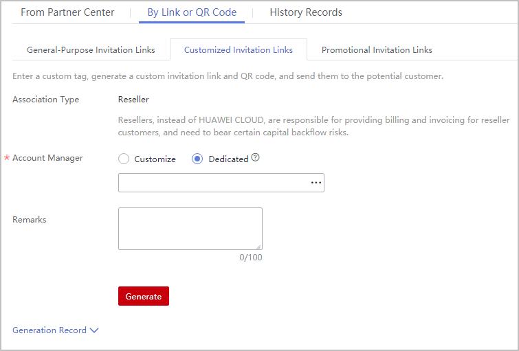 You can click Generation Record to view historical customized invitation links. You can also send a historical invitation link or QR code to a potential customer.