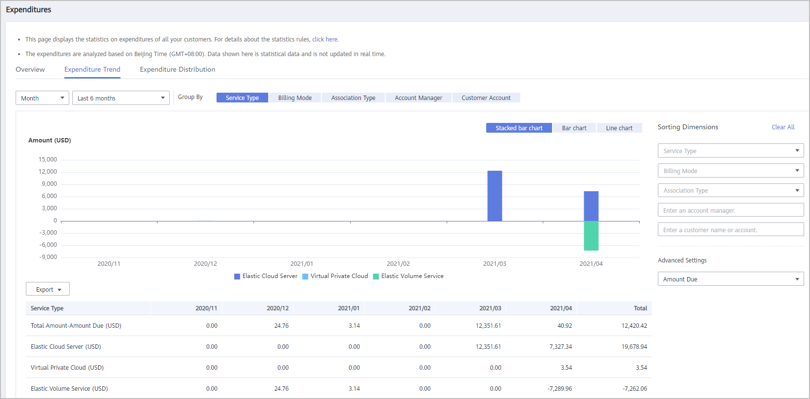 - Select the Expenditure Trend tab, select a time range, and set the grouping basis (service type, billing mode, association type, account manager, and customer account) to view the expenditure trend of customers and detailed fees. You can also set criteria in Sorting Dimensions and Advanced Settings on the right.