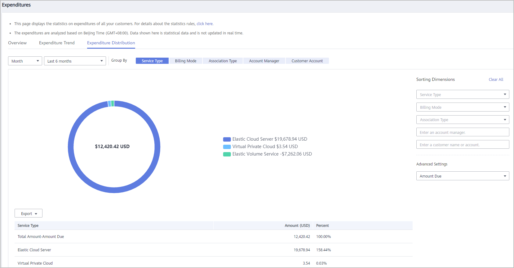 - Select the Expenditure Distribution tab, select a time range, and set the grouping basis (service type, billing mode, association type, account manager, and customer account) to view the expenditure distribution of customer expenditures and detailed fees. You can also set criteria in Sorting Dimensions and Advanced Settings on the right.