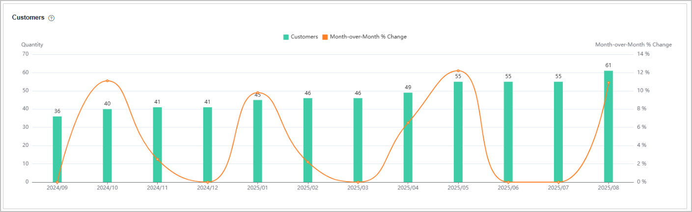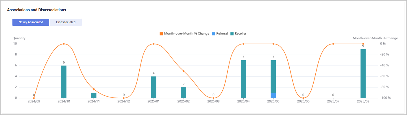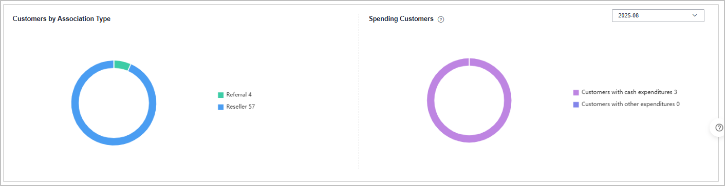 Partners can view their customer statistics, including the number of customers, newly associated customers, customer analysis, and disassociated customers.