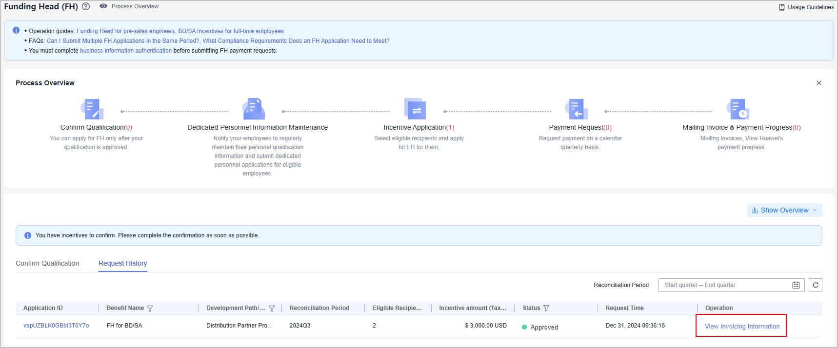 4. On the Request History tab, select an approved payment request and click View Invoicing Information in the Operation column.