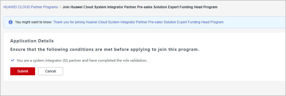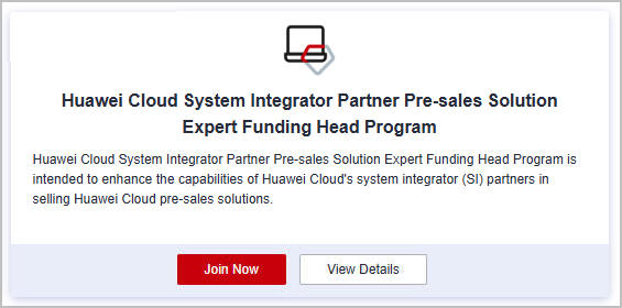 Help Center/ Partner Center/ User Guide/ Partner Programs/ Huawei Cloud System Integrator Partner Pre-sales Solution Expert Funding Head Program/ Joining Huawei Cloud System Integrator Partner Pre-sales Solution Expert Funding Head Program