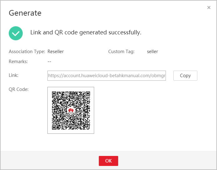 After receiving the invitation, the customer can click the link or scan the QR code to register with Huawei Cloud and associate with the partner. For details, see Associating with a Partner Using an Invitation Link.
